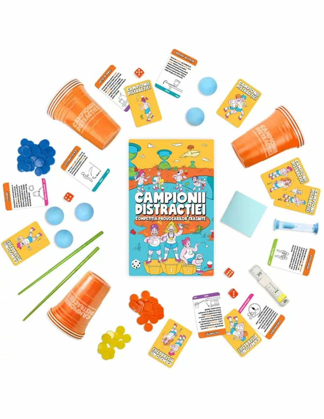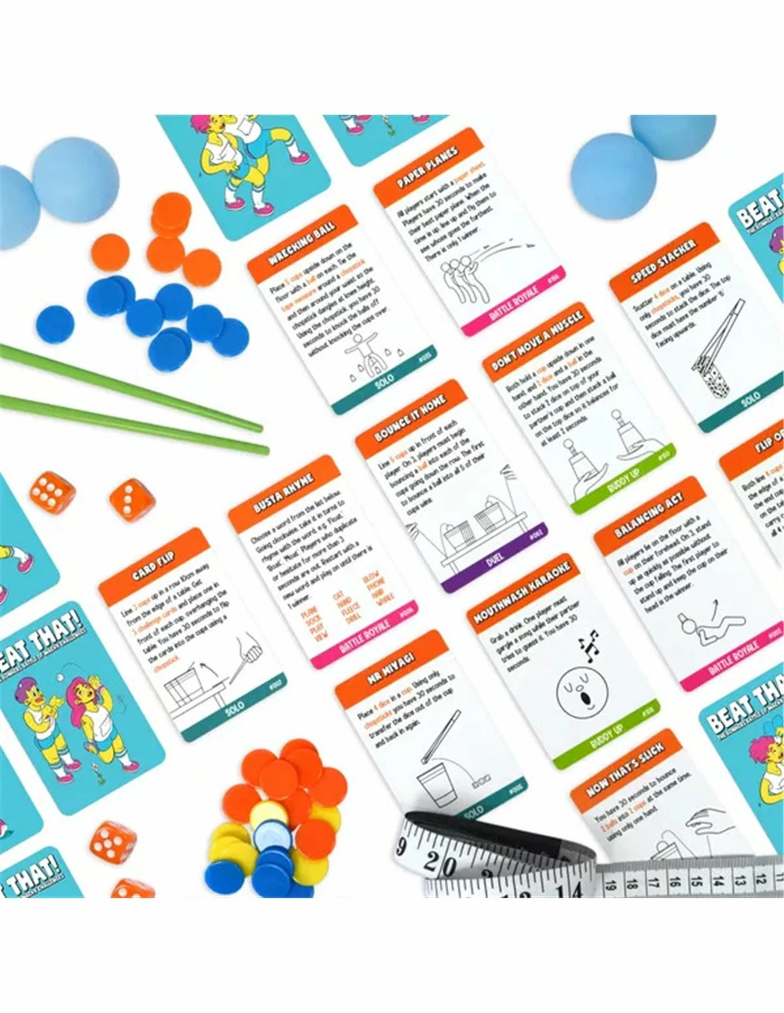 Beat That! consists of 10 rounds of challenges. Start by dealing 10 betting tokens to each player (tokens have different point values). Next, pick up a challenge card and read it aloud. All players then place a bet on their own ability to complete the challenge. Once bets are placed, go around the circle attempting the challenge. Players who succeed bank their points. The player with the most points at the end of 10 rounds is the champion!