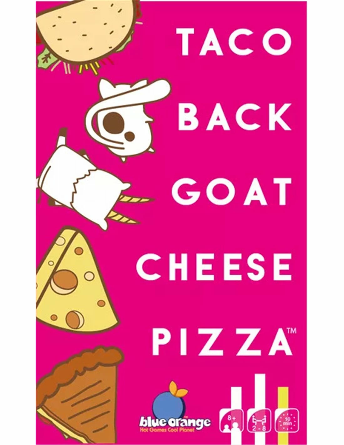As in Snap and Dobble, each player places a card from their hand face up into a community pile while saying taco/cat/goat/cheese/pizza in player sequence. When the card matches the mantra — boom! — everyone slaps their hand on the deck, with the last one to slap picking up the cards. Whoever rids themselves of cards first wins!