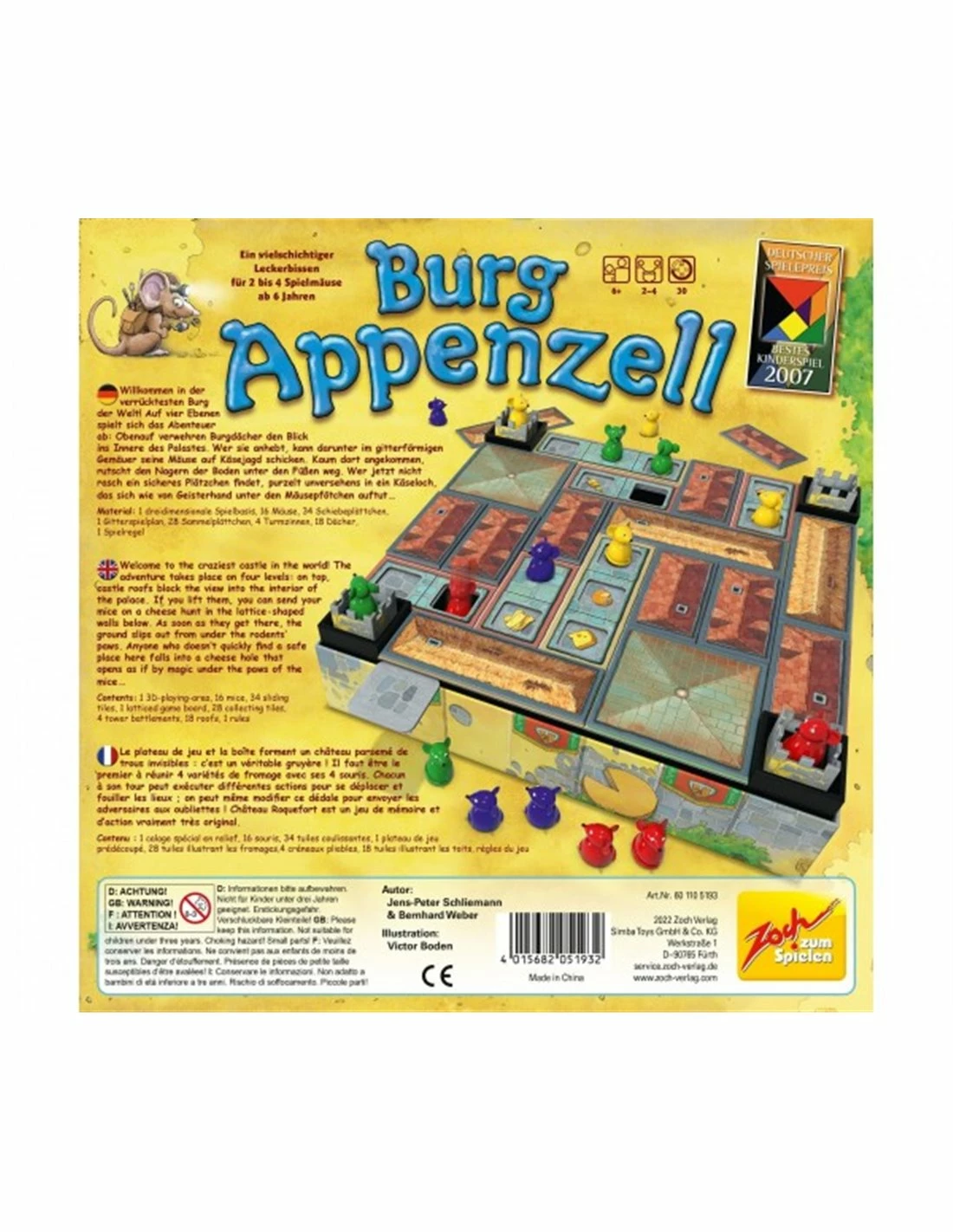 Each player controls colored mice and tries to collect pieces of cheese in Castle Appenzell. On their turn, players spend action points to put new mice into play, reveal corridors in the castle, move their mice around the castle, or push a tile into play, which changes the maze of cheese pieces underneath. If two of a single player’s mice reach a place with the same kind of cheese showing, the player obtains a piece of this cheese. The first player with 4 different pieces of cheese wins the game.