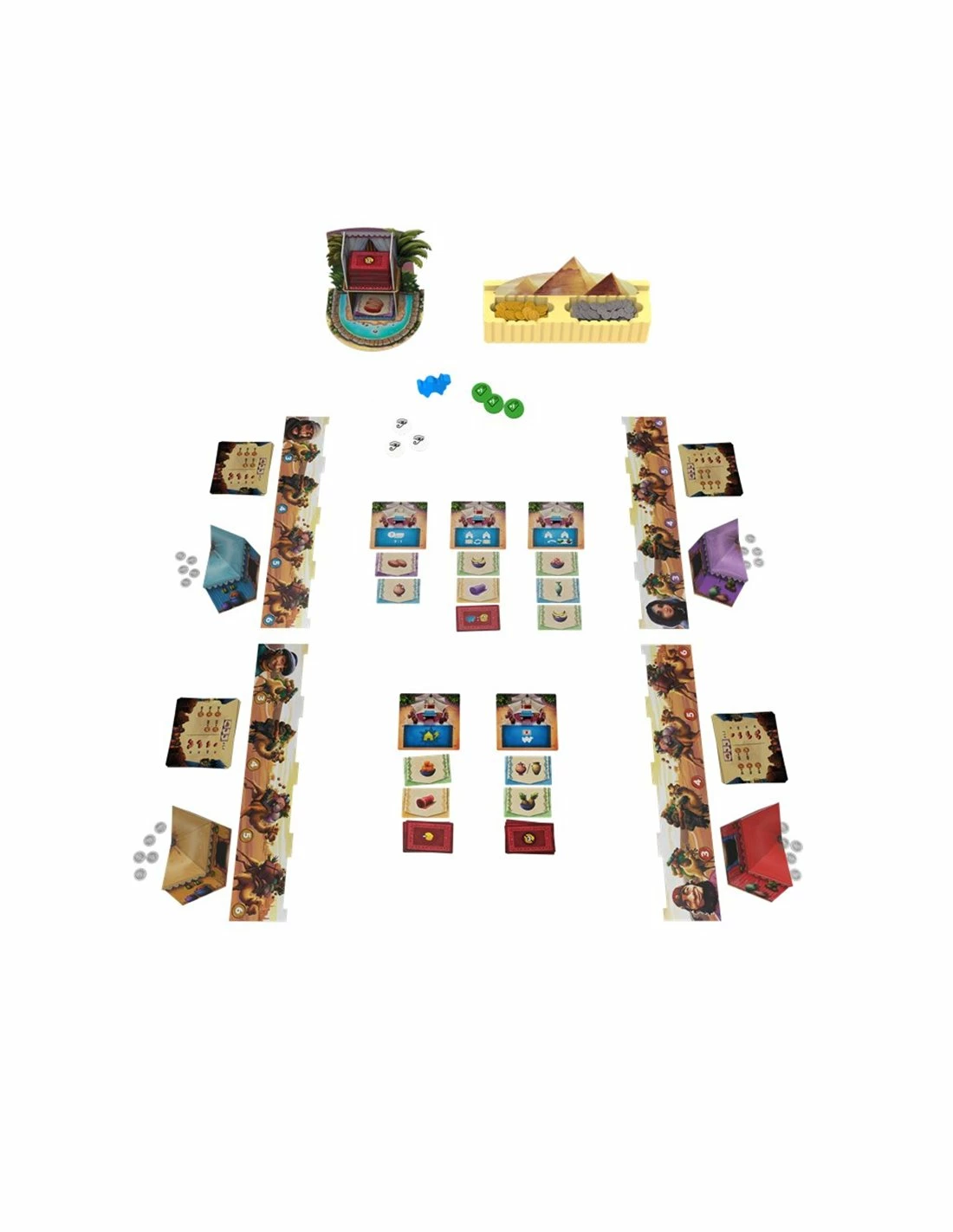 In Camel Up: Off Season, each of the 3-5 players has their own caravan of four camels that can carry goods, with the camels being able to carry 3, 4, 5, and 6 goods. Goods come in four types — carpets, vases, dates, and (non-date) fruit — and these goods will be available at markets, with one more market in play than the number of players. Each double-sided market indicates how many face-up and face-down cards are placed there, in addition to the special power of that market.