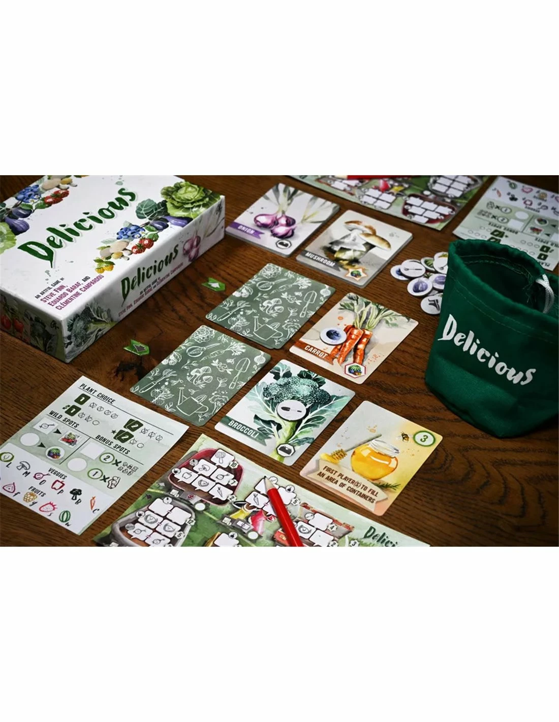 Over the course of a game of Delicious, players fill their respective gardens with fruits and vegetables by sketching them based on cards and tokens that are revealed in the community area. Players take their turns sketching simultaneously each round as these plants are revealed. Earn the most points by planting fruits and vegetables in your makeshift containers and planters.