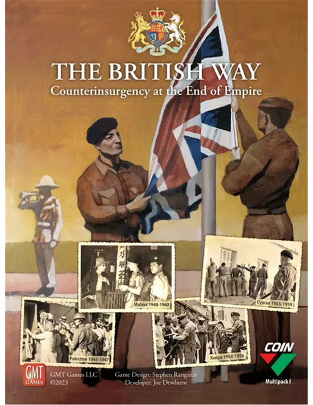 The British Way: Counterinsurgency at the End of Empire is the first of several COIN multipacks, containing four separate wargames exploring a series of thematically related insurgencies. Between 1945 and 1960, the British fought four major “emergencies”, as they referred to their counterinsurgency campaigns, each trying to manage their retreat from empire. The four games in this pack focus on exploring British counterinsurgent responses to a variety of different opponents, including communist insurgents in Malaya, militant nationalists in Kenya, and smaller and more clandestine terrorist organizations in Palestine and Cyprus. The games adjust the core COIN mechanics to provide a compelling new way of handling two-player conflicts, while also streamlining several mechanics to quicken gameplay. The British Way offers an approachable introduction to the COIN series for new players, while presenting experienced players with four mechanically distinct games to explore and compare.