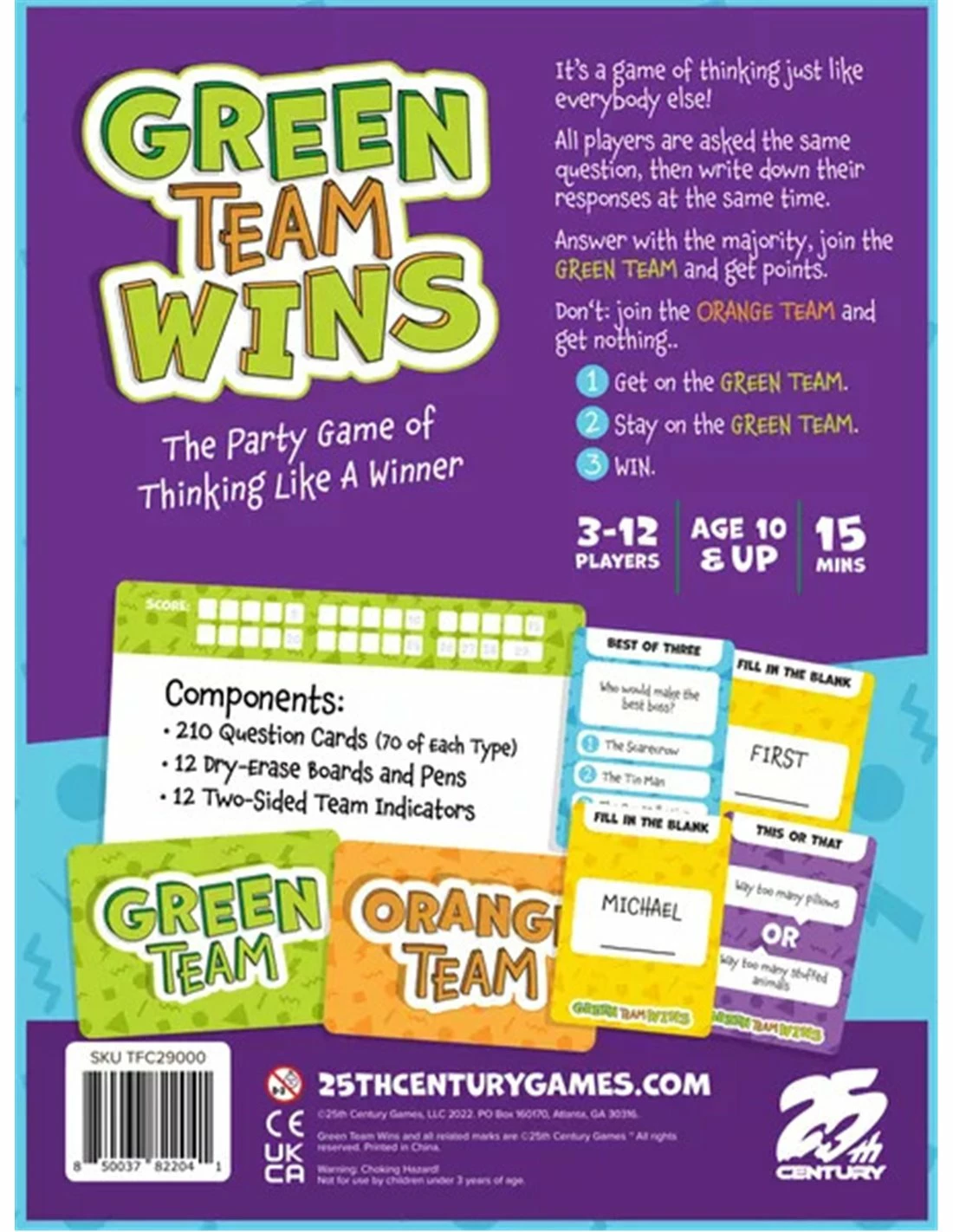 Everyone will be asked the same question, then writes down their responses at the same time. All players with the winning answer join the Green Team and score points. If your answer is not the most popular among the other players, then you join the Orange Team and score zero points for that round. Players joining the Green Team from the Orange Team will score one point. Players who are on the Green Team and stay on it will earn two points.