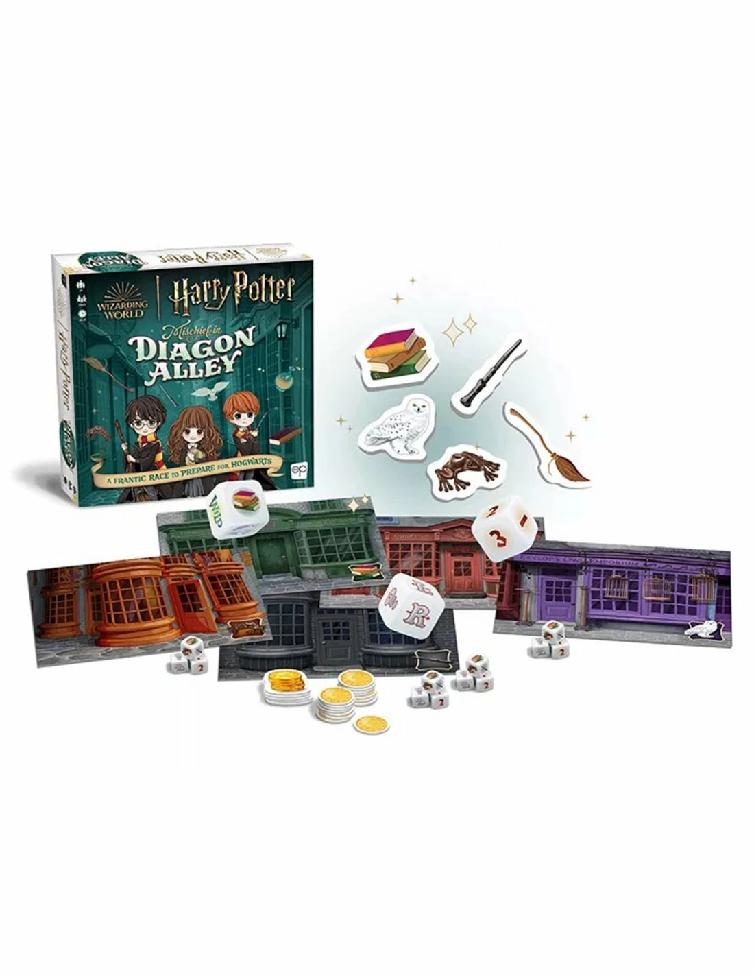 Manage the magical mayhem in this fast-paced, simultaneous play dice game inspired by the wizarding world of Harry Potter! First-year Hogwarts students are rushing to Diagon Alley with their shopping lists, but the magical items have been hexed and are found mixed up among all the shoppes! Quickly roll the dice to fling the scattered brooms, books, and other supplies back to where they belong to be the first one with an organized shoppe to win!