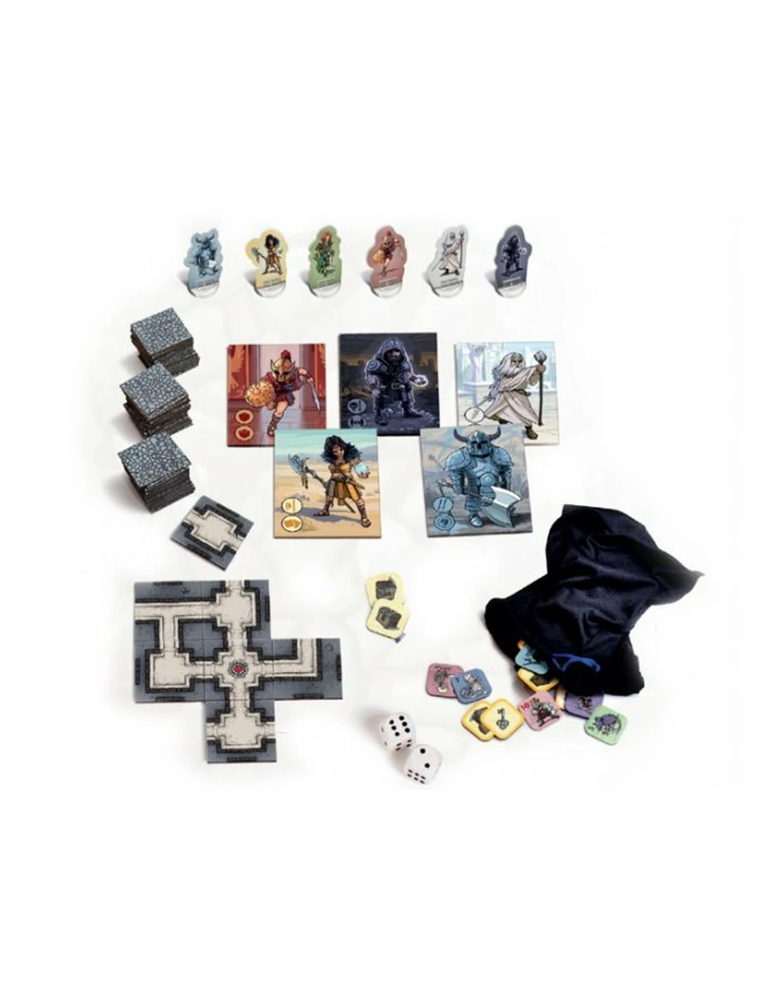In Karak, a.k.a. Catacombs of Karak, each player leads one of six different characters into the labyrinth. Tile by tile, they uncover what the labyrinth looks like, and it will differ on each playthrough. They have to equip themselves with weapons and spells, fight monsters, and (most importantly) collect treasure. The player with the most treasure at the end of the game wins — a true champion of Karak!