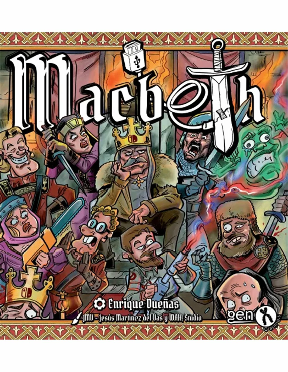 Macbeth is a crazy dice game from 2 to 5 players, very short and intense. Each player secretly supports several noble characters. A player will win if, at the end of the game, one of his nobles is king. But, BEHOLD! Do not think that it will be easy! if you want the crown, you will have to take risks, lie, bribe and stab every fool who cross your path. Also, if you have bad luck in the dice rolls, you will lose everything you have won before one would say “break a leg”.