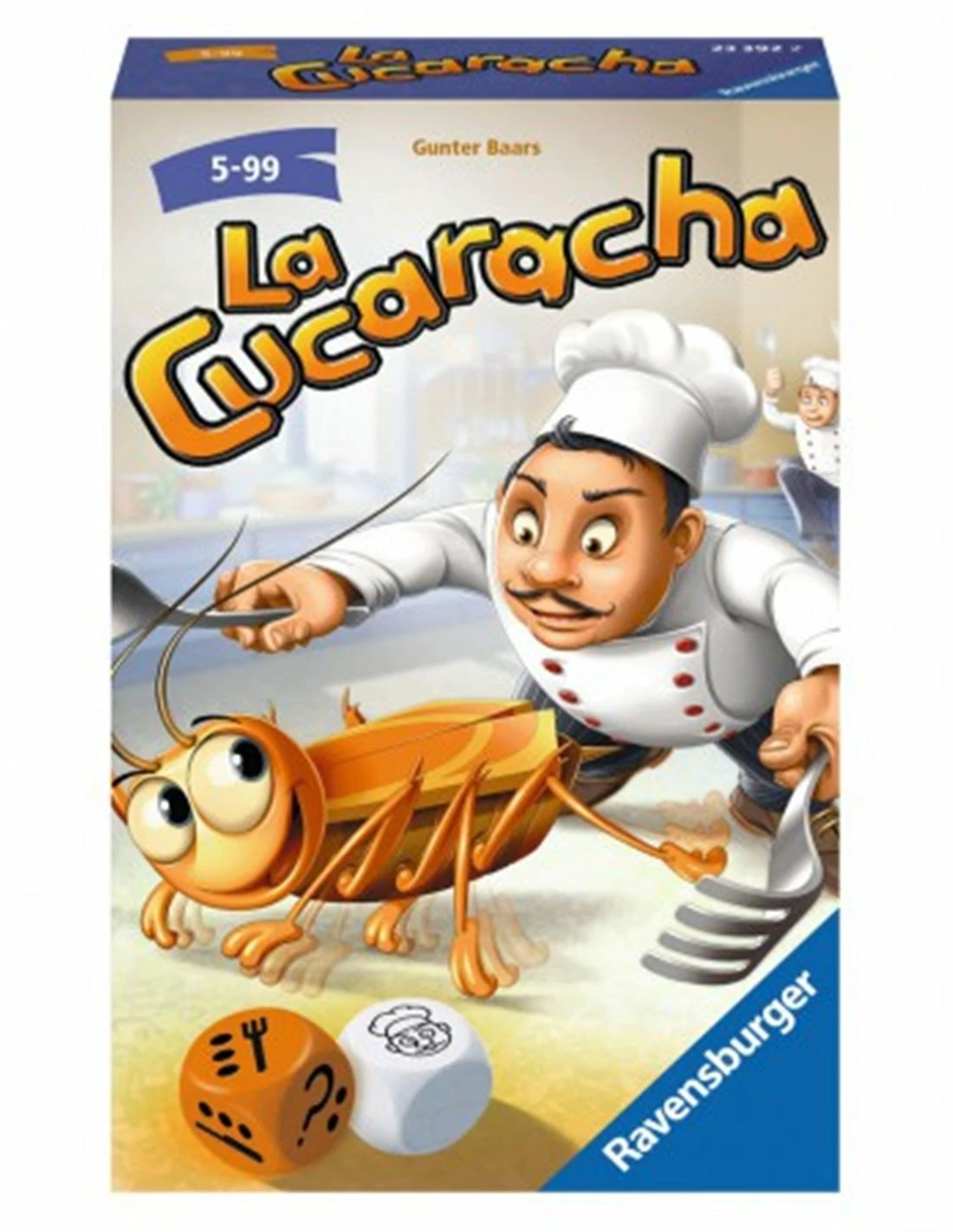 Kakerlakak includes action rules that speed up gameplay. The cockroach and cook players both roll simultaneously, with the cockroach player moving as quickly as possible because as soon as the fifth cook face is rolled, the turn is over. The winning condition remains the same.