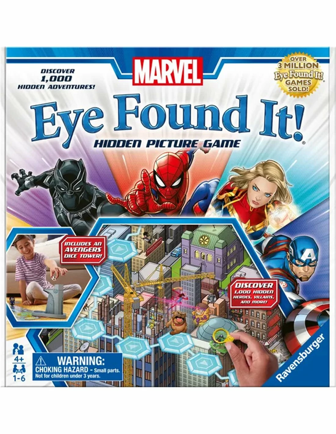 Search for hundreds of hidden illustrations in the Marvel Universe in Marvel: Eye Found It! while visiting Wakanda, Asgard, and everywhere in between on a large game board with your favorite Marvel characters.