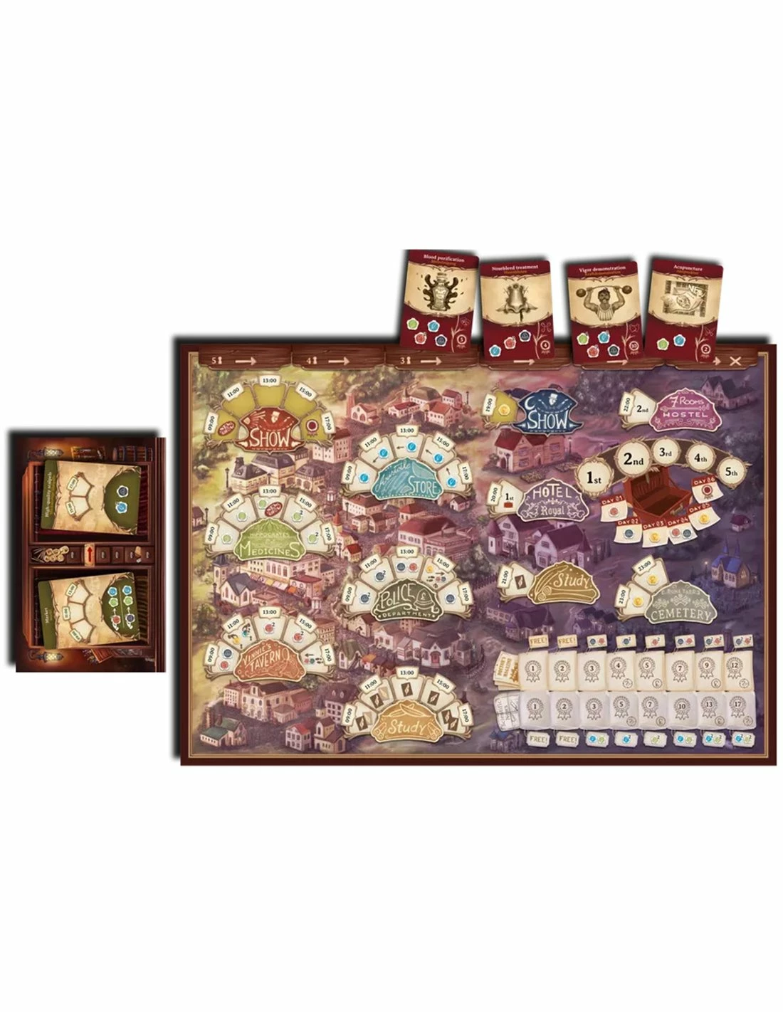 The game takes place over six days (rounds). At the start of each day, players prepare their schedules by booking time slots at locations around town, then the day’s events happen according to these schedules. Players will gather medicine and equipment, employ accomplices, bribe the police, and perform shows — but not all plans run smoothly. Other players will create stock shortages, steal your audience, and snatch up those essential time slots! Performing shows in related sets grants fame bonuses, as does getting your name in the local newspapers. Grave-robbing in the night damages your reputation, but earns cash! At the end of a busy week, the player who has earned the most fame wins.