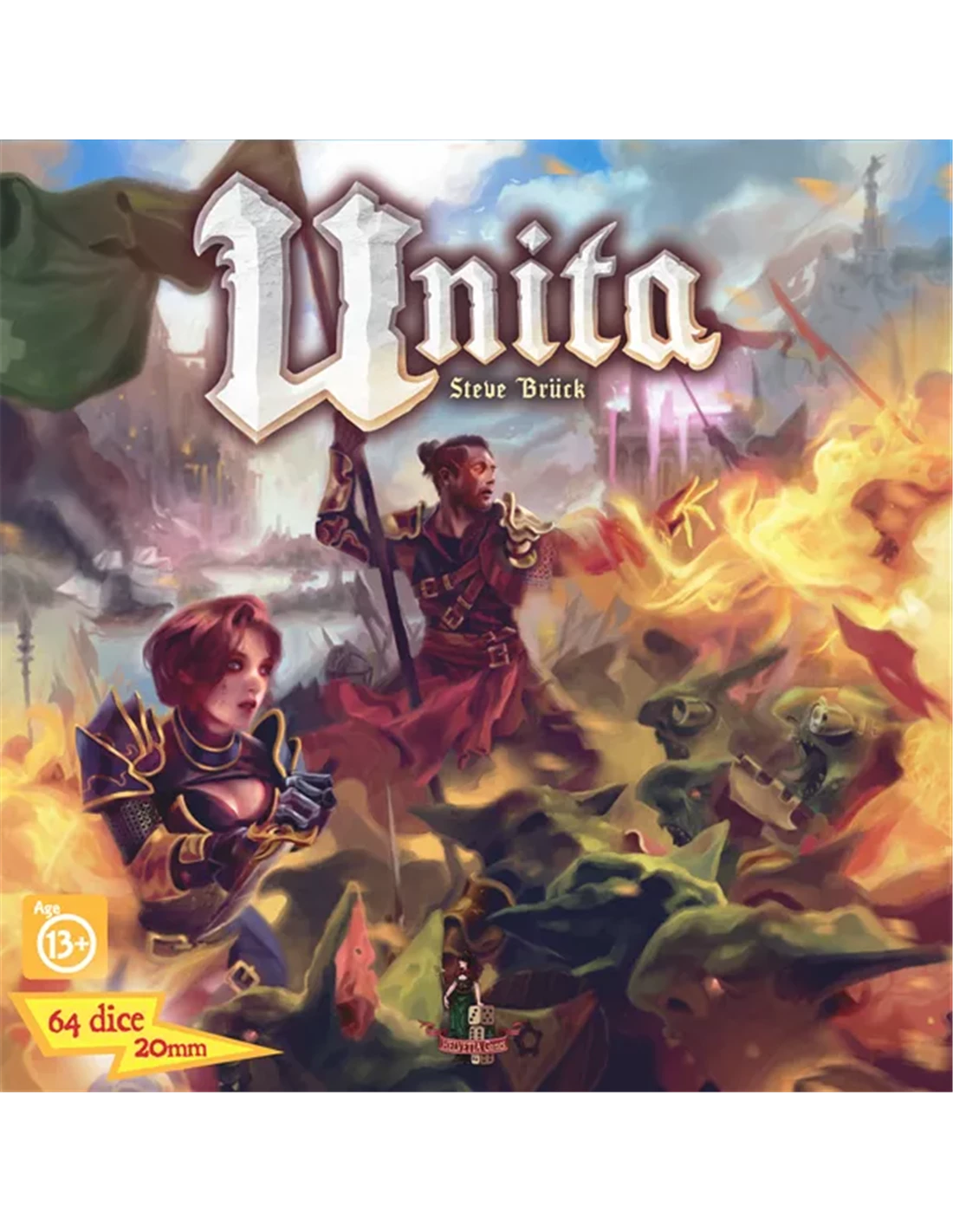 Unita features 64 dice but not an iota of luck! You can be the men of Primitiva, the Nuns of Friburga, the Engineers of GermanLand or the Frogs of the Hexagone, but no matter your role, forge ahead on the warpath, lead your army in the mad rush to get to the Magic Gate, and put an end to all these afflictions. Move forward on the path of the war with your army compound of six-sided dice. Every time you contact an opposing army, a fight takes place, with the least hardy losing a point of strength. When your army reaches the magic gate, the army disappears, and the total of its points of strength (its dice) becomes your points of victory.