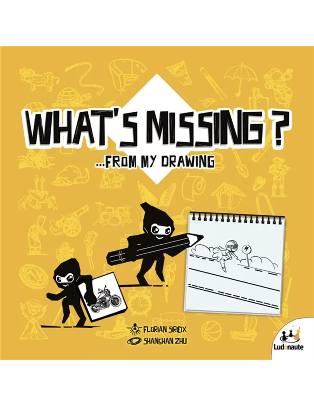 What’s Missing? is a drawing game that contains 240 cards with line drawings, sorted by difficulty. In a round, each player takes a card, hides it behind a cardboard screen, and tries to draw another picture on transparent paper placed on top of that card, with the goal being that the drawer wants other players to guess what’s on the card.