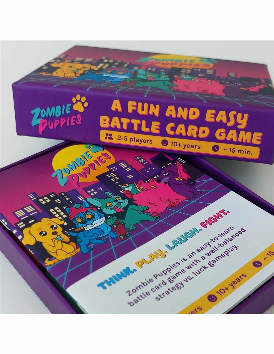 You can play this dynamic card game with 2-5 players, regardless of their language. Zombie Puppies can be learned in 5-10 minutes, requires strategic thinking, and gives you a whole new card game experience.